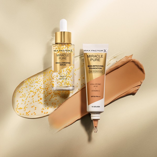 Tο νέο Μiracle Pure Skin-Improving Foundation αποτελεί το πρώτο foundation της Max Factor που συνδυάζει την κάλυψη με το skincare και είναι κατάλληλο για κάθε τύπο επιδερμίδας. Η ανάλαφρη και κρεμώδης σύνθεσή του είναι εμπλουτισμένη με εκχυλίσματα κολλαγόνου, υαλουρονικού οξέος και Βιταμίνης C, που λειαίνουν την επιδερμίδα και βελτιώνουν άμεσα την όψη της.