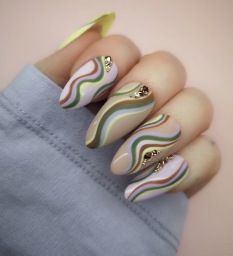 Φαίνεται πως τα σχέδια με κυματιστές μινιμαλιστικές γραμμές βρίσκονται στην κορυφή της λίστας για το 2021. Αυτή η πιο μινιμαλιστική προσέγγιση σημαίνει ότι τα νύχια γεμάτα γλίτερ, βελούδο, τυρκουάζ και μαρμάρινα σχέδια, είναι πιθανό να μην ευνοηθούν.